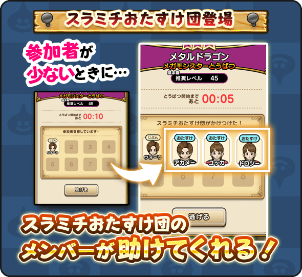 「スラミチおたすけ団」はメガモンスターとうばつ戦で、冒険者の参加人数が一定数を下回る時に、スラミチおたすけ団のメンバーが戦闘を手伝ってくれる機能です。