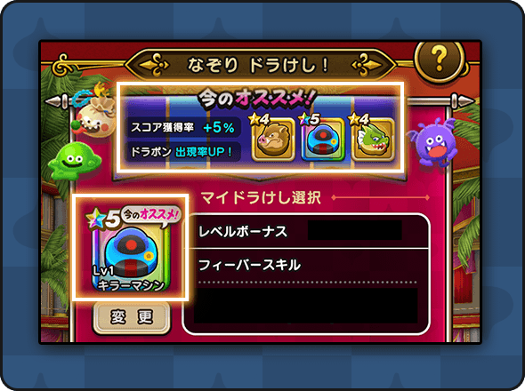 「今のオススメ!」にセレクトされたドラけしをマイドラけしに設定すると、スコアボーナスがついたりドラポンカプセルの出現率がアップします!