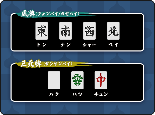 中でも、風牌(フォンパイ/カゼハイ)、三元牌(サンゲンパイ)の2種類に分けられます。