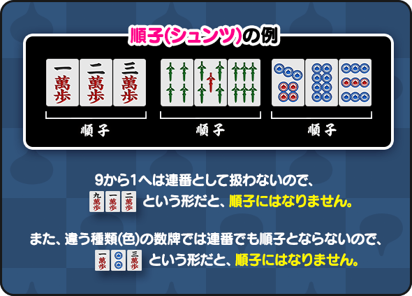 順子とは、同じ種類かつ数字が連続した数牌で、3枚1組の組み合わせのことです。