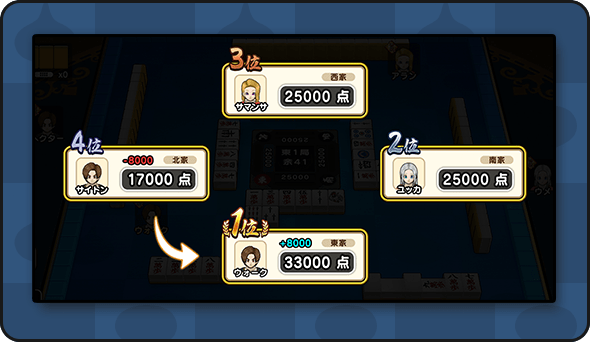 局が終わると、あがり方などの状況によって、プレイヤー間で点数が移動します。