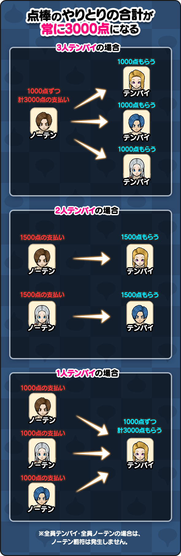 その際は、点数のやり取りの合計が±3000点になるように、テンパイしてないプレイヤーからテンパイしているプレイヤーに点数が移動します。