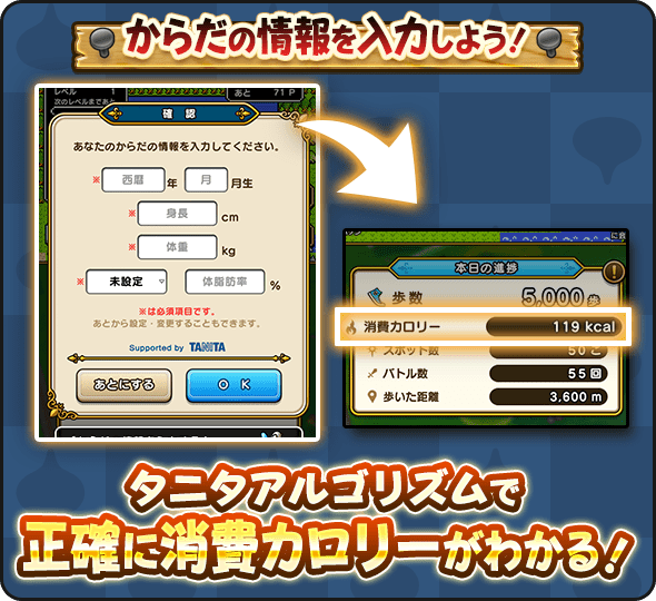 ここを入力することで、「タニタアルゴリズム」を用いて歩数に応じた消費カロリーが測れるぞ!