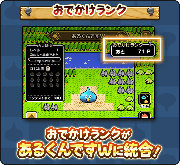歩いた地域に応じて、スライムになじみ度がたまっていくぞ!