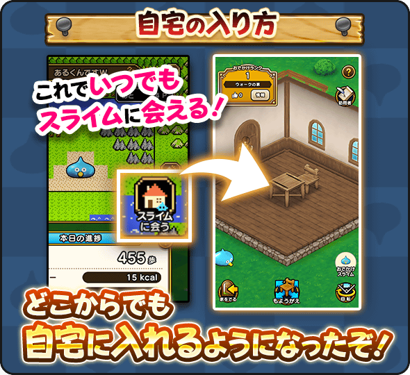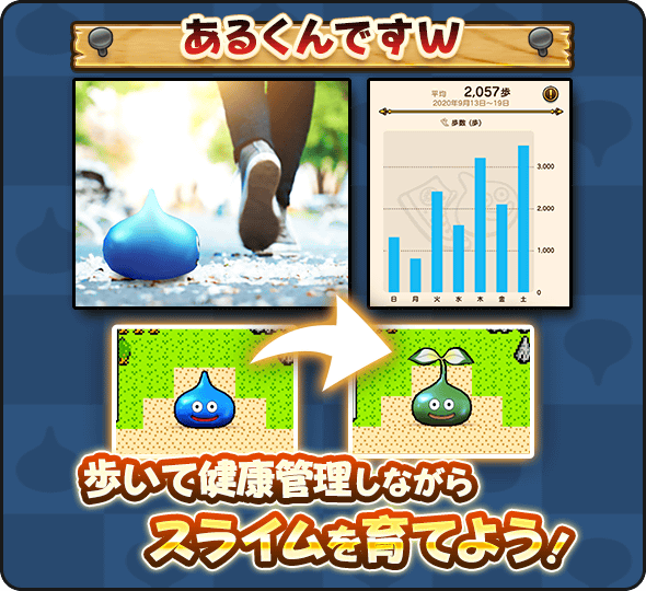 「あるくんですW」の「あるいてストーリー」の項目では、歩数に応じてスラミチがアレフガルドをイメージした世界を進んでいくぞ!