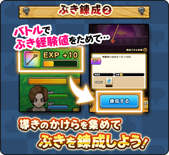 「ぶき経験値」が貯まると、「導きのかけら」と「ゴールド」を使って「ぶき錬成」ができるぞ!