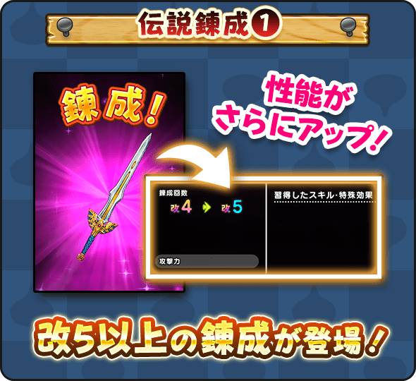 対象ぶきを改4に錬成して「伝説錬成」を行うと、ぶきの性能がさらにパワーアップするぞ!