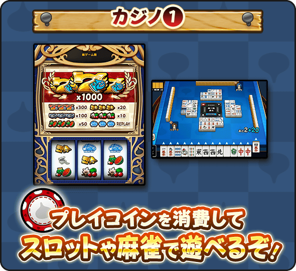 カジノでは、プレイコインを使って「スロット」とスラミチ式麻雀「ツモるんです」で遊べるぞ!