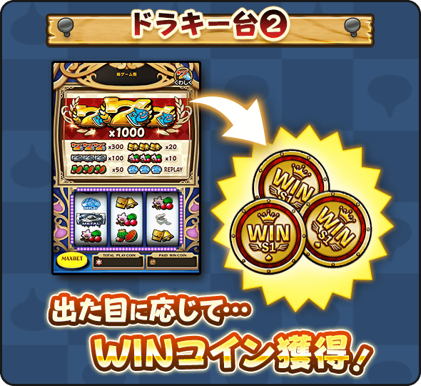 カジノの「スロット」や「ツモるんです」で遊ぶと、結果に応じたWINコインが手に入るぞ。