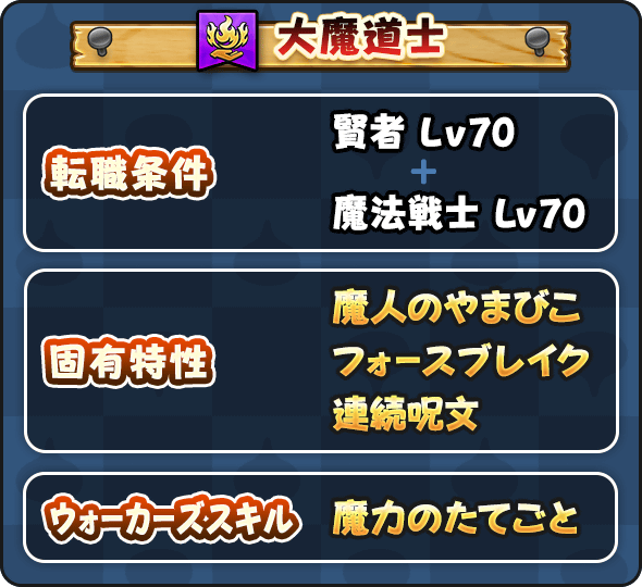 大魔道士には、上級職「賢者」「魔法戦士」をLv70以上にすると転職できるぞ!