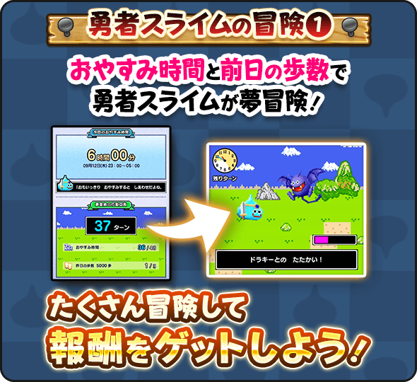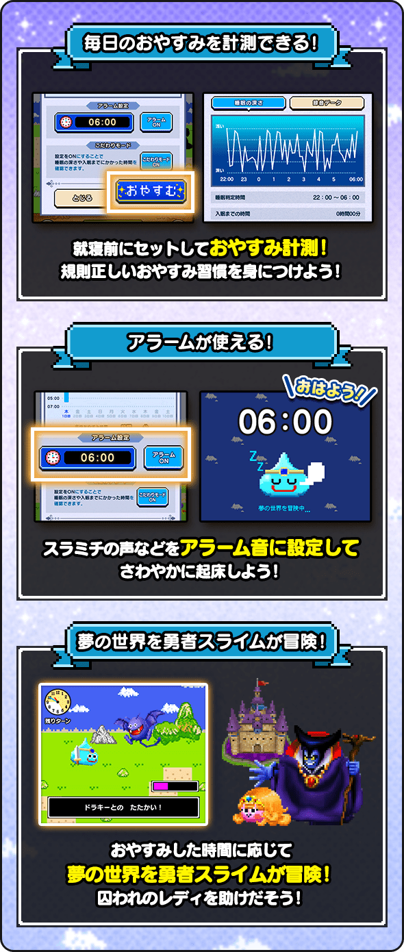 おやすみした時間の分だけ、夢の世界を勇者スライムが冒険する「夢冒険」を楽しめるぞ!