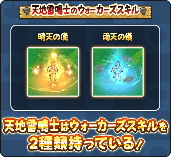 - 天地雷鳴士は2種類のウォーカーズスキルを持っています。ウォーカーズスキル使用時にどちらか一方を選んで発動させることができます。