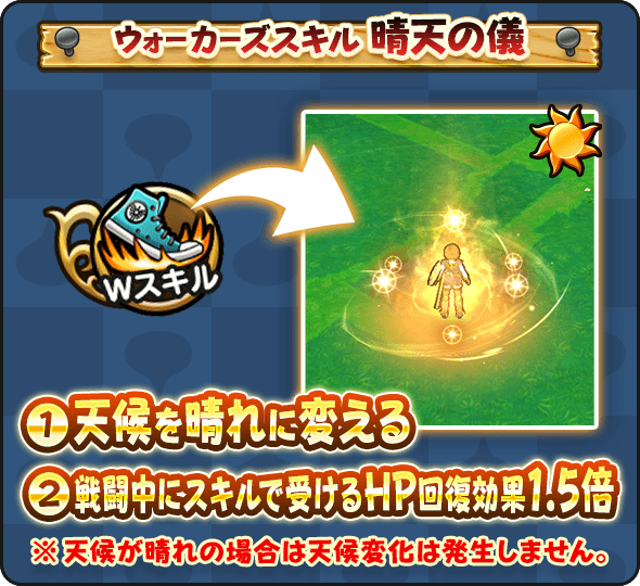 フィールドの天候を晴れに変え 一部を除く戦闘においてスキルで受けるHP回復効果を1.5倍にする(効果10分)