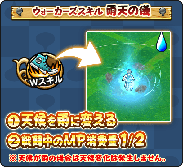 フィールドの天候を雨に変え 一部を除く戦闘においてMP消費量を1/2にする(効果10分)
