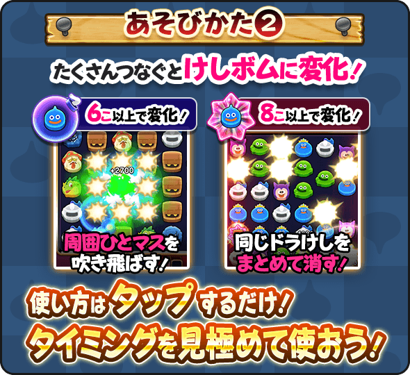 けしボムを使いこなすことで、より効率的にたくさんドラけしを消すことができるぞ!